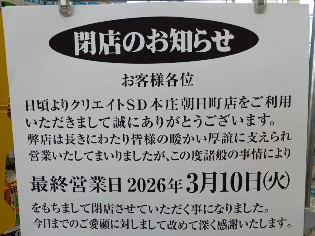 【本庄市】朝日町のドラッグストア「クリエイトSD本庄朝日町店」が3月10日をもって閉店するそうです。