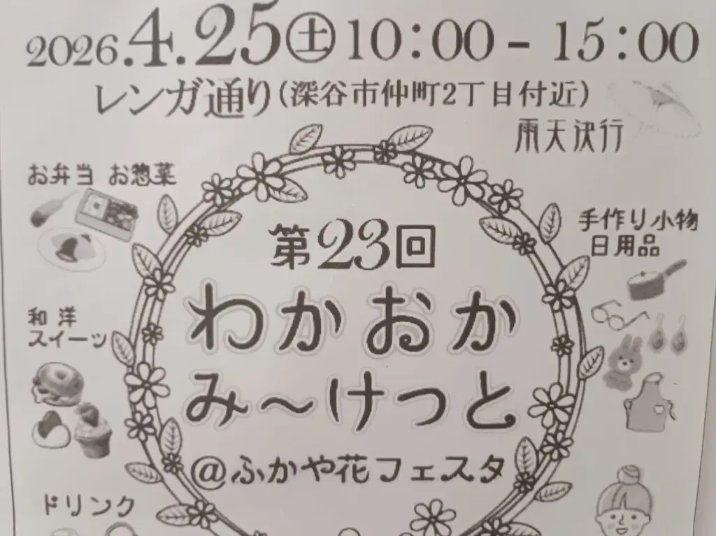 仲町2丁目付近のレンガ通りで「第23回わかおかみーけっと」が2026年4月25日(土)に開催されます。開催時間は10:00~15:00、雨天決行です。202604わかおかみーけっと「わかおかみーけっと」は深谷商店街の若女将による深谷商店街連合会活性隊若女将の会が主催されているイベントです。深谷商店街を盛り上げ、深谷の魅力を発信しています。202604わかおかみーけっと「第23回わかおかみーけっと」では、お弁当・お惣菜、和洋スイーツ、ドリンク、手作り小物・日用品などが出店される予定です。深谷の美味しい、楽しい、うれしいお店が大集合します。202604わかおかみーけっとこちらは開催場所になる仲町2丁目付近の「レンガ通り」です。JR高崎線深谷駅北口から市役所までの通りで、きれいにレンガが敷き詰められており、様々なお店が立ち並ぶエリアです。2026ふっかパーク「第23回わかおかみーけっと」は4月25日(土)・26日(日)に開催される「ふかや花フェスタ」の会場からも近く、楽しい街歩きができそうです。お気軽に立ち寄ってみてはいかがでしょうか。